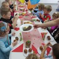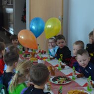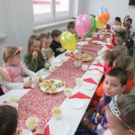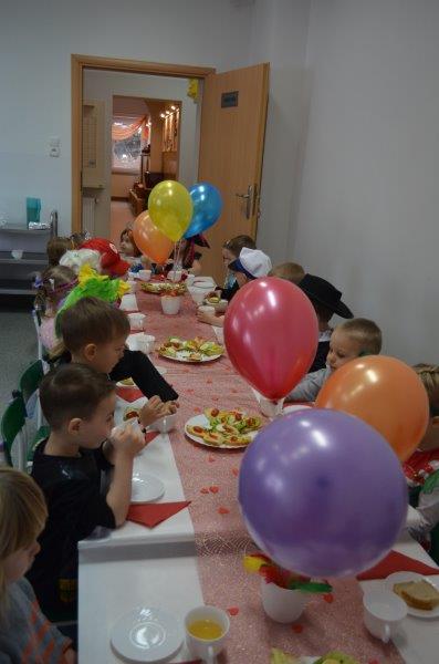 Sala dzieci grupy Motylków przeobraziła się w okazale udekorowaną salę balową, w której można było poczuć atmosferę radości i karnawałowego nastroju. Zadbano także o dekorację stołów i pozostałych pomieszczeń przedszkola.
